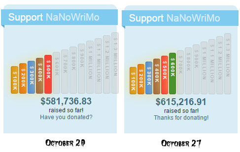 On October 20th, NaNoWriMo had secured $581,736 in donations. A week later they had $615, 215. So leading into November 1, they earned $33,479 in one week. I wonder if their donations speed up or slow down after November 1… I guess we’ll find out. Yesterday I donated to the cause, and here’s a list of all the “stuff” I get as a result: