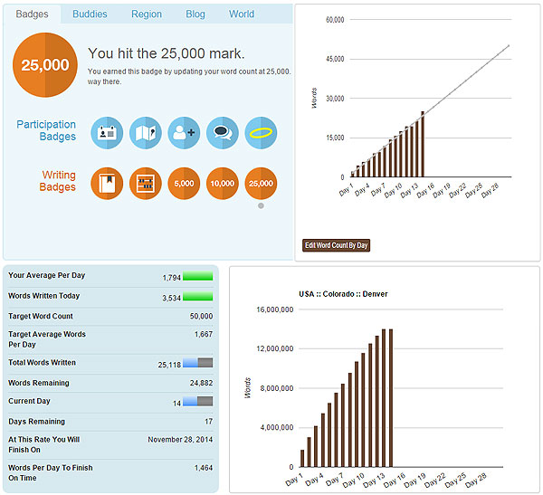 Here’s a graphic showing the four main statistics from the NaNoWriMo site. In the upper left-hand corner are the Participation Badges (completed) and the Writing Badges, displaying my latest accomplishment of 25,000 words. The next Writing Badge to earn is by validating my word count, but I can’t do that yet, because I’m not at 50,000 words.