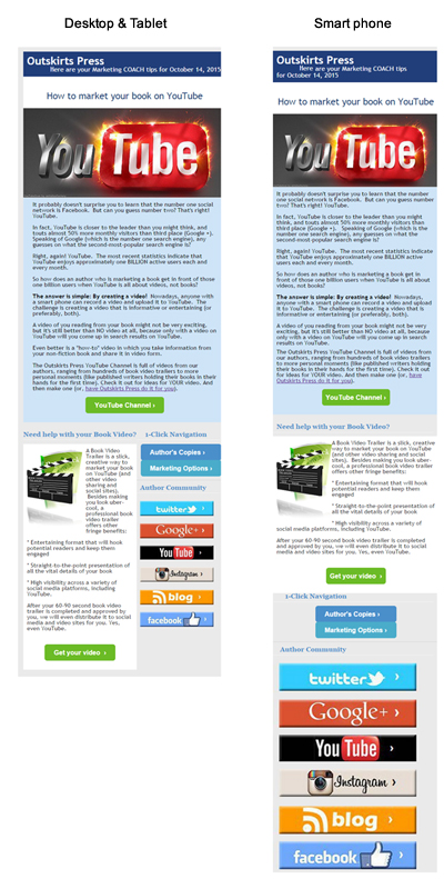 Over the last couple of months I have been blogging about the steps Outskirts Press is taking to transition all our web properties and email communications to RWD (responsive web design), which allows for an aesthetic and functional user-experience that is seamlessly branded regardless of the type of device being used by our clients.